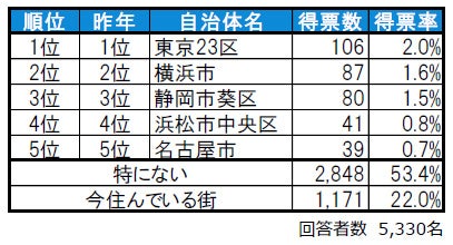 4年連続で東京23区が1位に輝きました。2位は横浜市、3位は静岡市葵区で、2年連続でのランクインです。トップ5のうち3つは、静岡県以外の自治体(東京23区・横浜市・名古屋市)となっています。