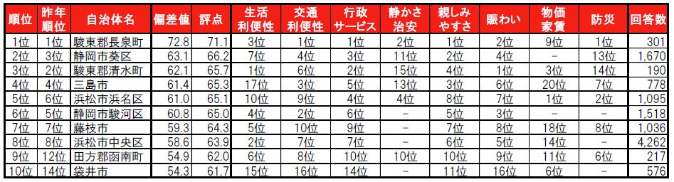 1位の長泉町、3位の清水町は、いずれも駿東郡に属する「町」で、今年も上位にランクインする結果となっています。