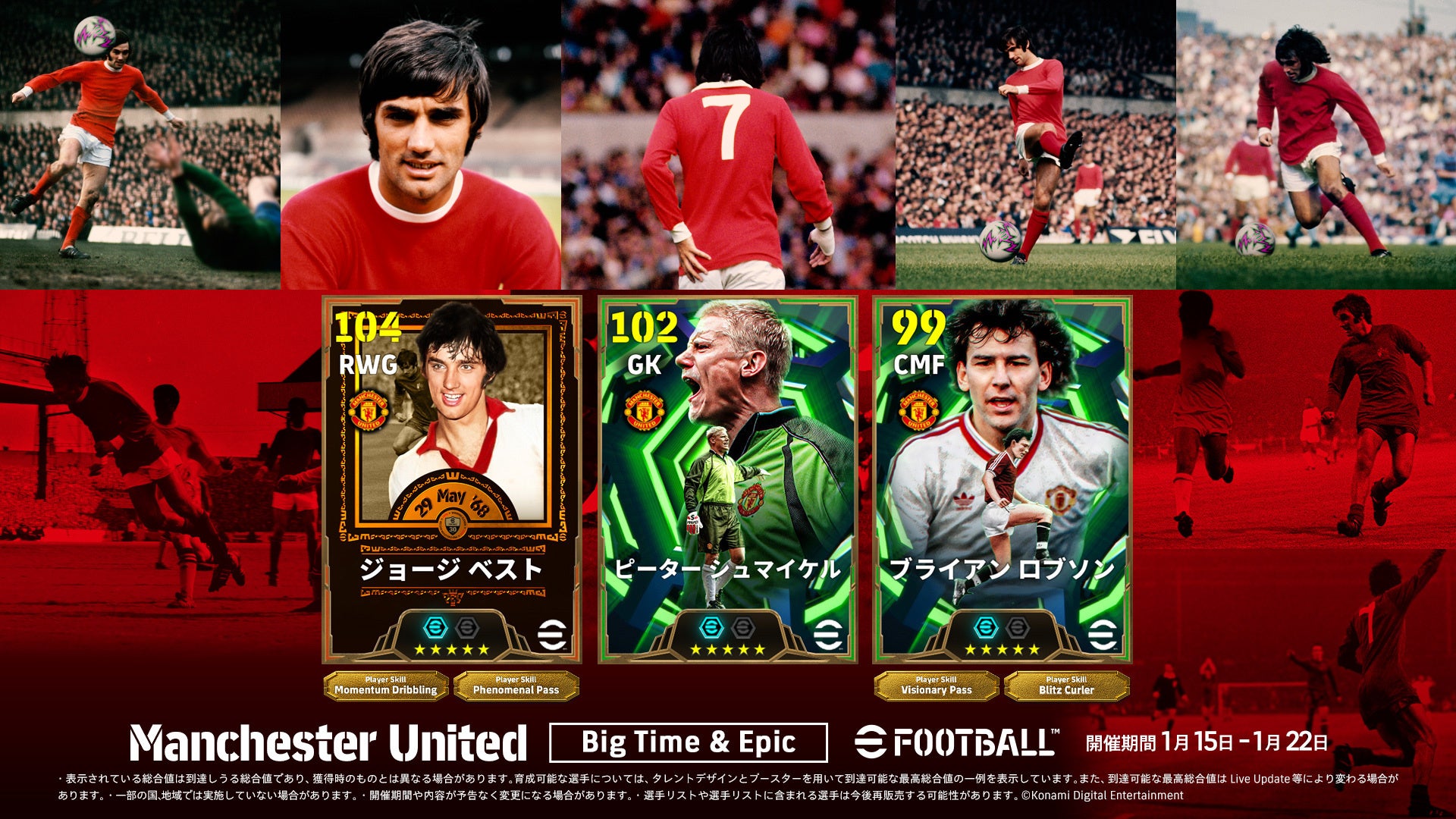 ゲーム内には、赤い悪魔として恐れられたマンチェスター ユナイテッドのレジェンドである「BigTime:ジョージ ベスト」・「Epic:ピーター シュマイケル」・「Epic:ブライアン ロブソン」が「Big Time & Epic: Manchester United」として登場中です。