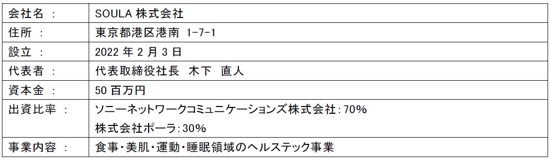 ソニーネットワークコミュニケーションズ株式会社(代表取締役執行役員社長:渡辺潤/本社所在地:東京都品川区、以下「ソニーネットワークコミュニケーションズ」)と株式会社ポーラ(代表取締役:及川美紀/本社所在地:東京都品川区、以下「ポーラ」)は、ヘルステックサービスを提供する新会社『SOULA(ソウラ)株式会社』(以下、「SOULA」)を2022年2月に設立し、事業を開始します。