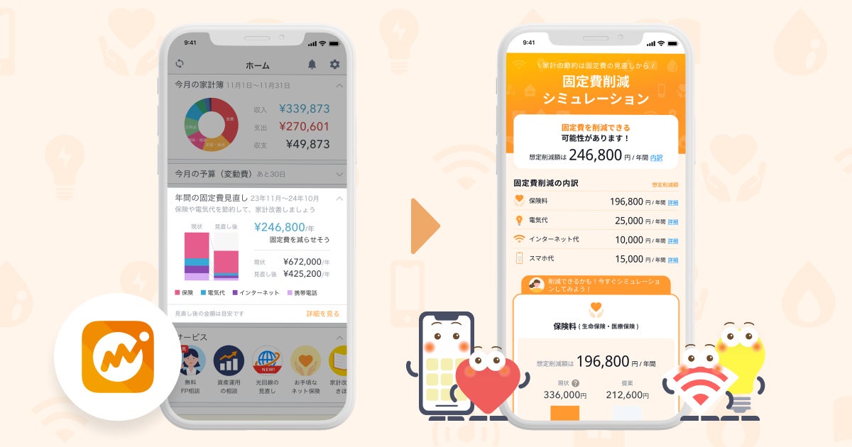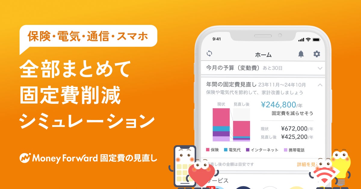 マネーフォワードホーム株式会社は、『マネーフォワード 固定費の見直し』において、『マネーフォワード ME』アプリ版と連動し、固定費(保険料、電気代、インターネット代、スマホ代)の年間支出額と、その削減可能性が一目で分かる新機能を提供開始※1しました。また、『マネーフォワード 固定費の見直し』のシミュレーションページもアップデートし、ユーザーは保険料、電気代、インターネット代、スマホ代の4つの費目で、年間支出額と想定削減金額、見直しの必要有無を確認できます。