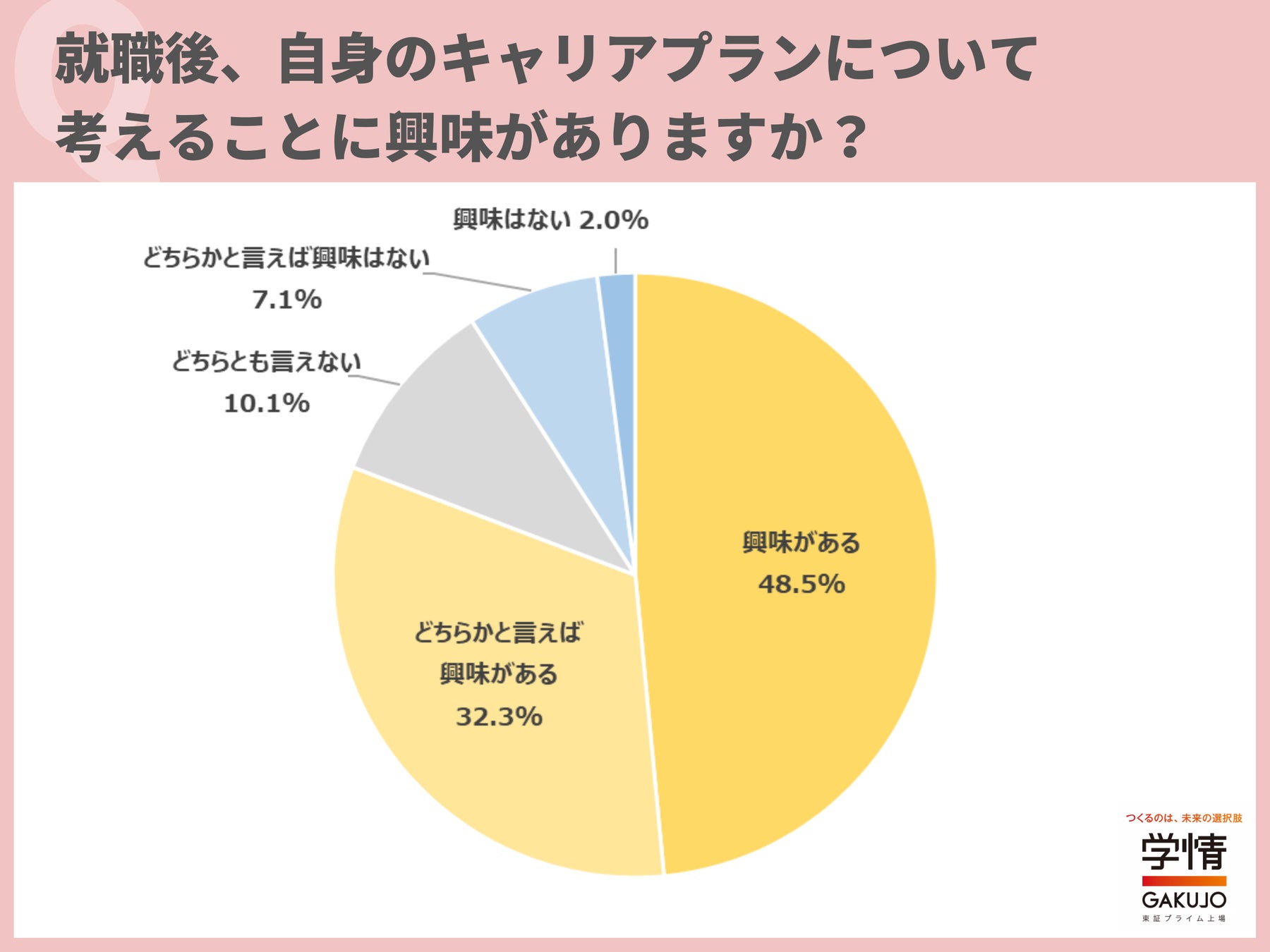 自身のキャリアプランを考えることに「興味がある」と回答した新社会人が48.5%に上りました。「どちらかと言えば興味がある」32.3%を合わせると、8割以上の新社会人が自身のキャリアプランについて考えることに「興味がある」としています。「キャリアプランを考えることは人生設計の一部だと捉えている」「社会人生活の大部分は仕事が占めるので、自分の責任でキャリアを選択したい」「キャリアプランを考えることで、目の前の仕事に対して目標を持って取り組むことができると思う」といった声が上がりました。