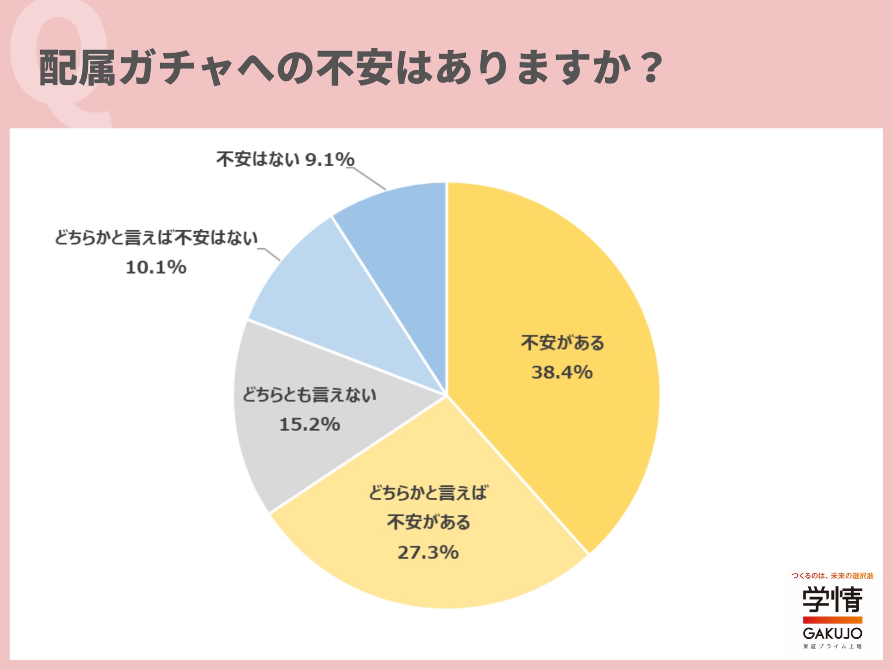 配属ガチャへの「不安がある」と回答した新社会人が38.4%に上りました。「どちらかと言えば不安がある」27.3%を合わせると、7割に迫る新社会人が「配属ガチャへの不安がある」としています。「自分の苦手な分野の業務を行う部署に配属されないか不安」「適性のない部署に配属されてしまうと、成長スピードが遅くなりそう」「配属先は業務内容だけではなく、部署の雰囲気や人間関係などの職場環境にも大きく関わってくると思う」といった声が寄せられています。