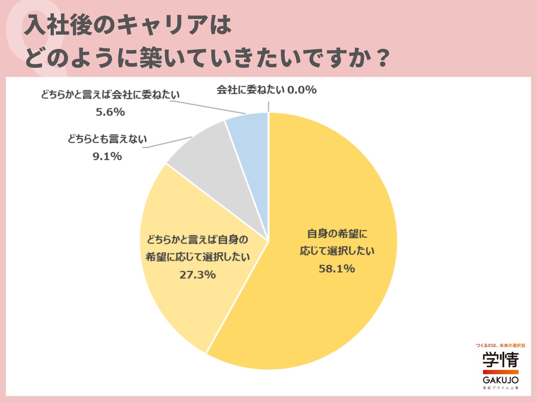 株式会社学情(本社:東京都中央区)は、2025年4月に入社を控える新社会人(以下、新社会人)を対象に、インターネットアンケートを実施。今回は、「新社会人のキャリア観」について調査しました。入社後のキャリアについて、「自身の希望に応じて選択したい」と回答した新社会人が9割に迫りました。「自分の意思で選択をしたほうが、モチベーション高く働けると思う」「一定会社に委ねる部分もあると思うが、できるだけ自分の希望するキャリアを歩みたい」などの声が寄せられています。また、配属ガチャへの「不安がある」の回答が7割に迫りました。「自分の苦手な分野の業務を行う部署に配属されないか不安」「適性のない部署に配属されてしまうと、成長スピードが遅くなりそう」といった声が寄せられています。