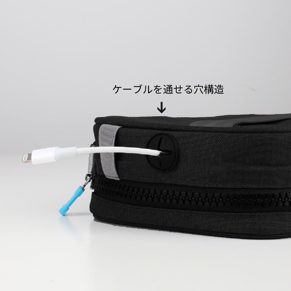 また、充電用途などでケーブルを外に出したい際に、ポーチを締めたままケーブルを出せる専用の穴を設けています。