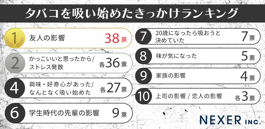 「興味・好奇心があった」に並ぶ同率第4位は「なんとなく吸い始めた」でした。