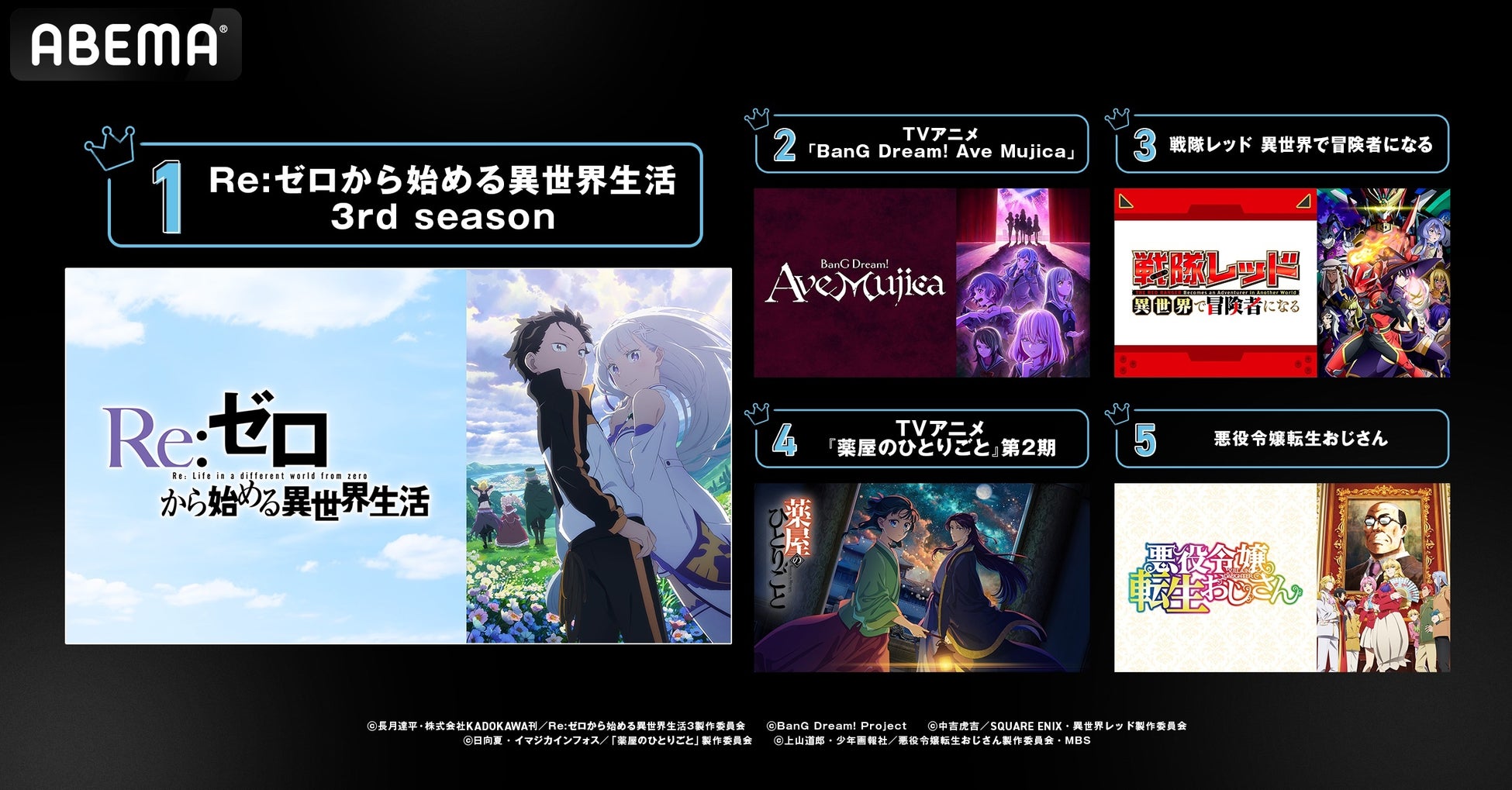 2025年新作冬アニメの「ABEMA」最終ランキングを発表!再生数部門では『薬屋のひとりごと』第2期がコメント数部門では『Re:ゼロから始める異世界生活 3rd season』が堂々1位に