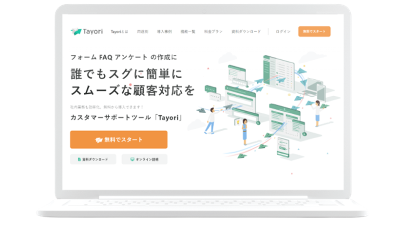 「Tayori」は、少人数でも最適な顧客体験を提供するカスタマーサポートツールです。「フォーム」「FAQ」「チャット」「アンケート」4つの基本的な機能をノーコードで専門知識無く作成・運用できます。2015年からサービス提供開始、アカウント数は2022年11月に6万アカウントを超えています。現在はカスタマーサポートはもちろん、社内業務への活用など、幅広い業種や用途でご利用いただいています。サービス名「Tayori」(読み:タヨリ)には、「お便り」のように大切な想いや願いを届けるサービスでありたいという気持ちをこめています。サービスロゴの紙飛行機は、温かさ、軽やかさ、手軽さ、気持ちをつなげるイメージを表現しています。