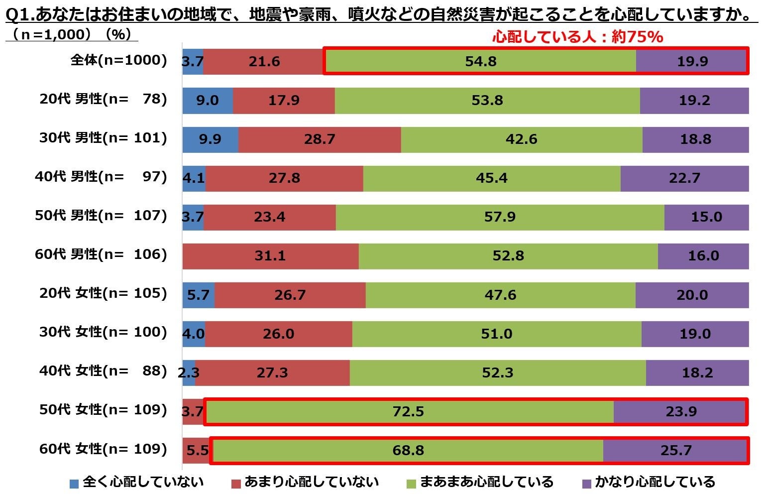 ・地震などの自然災害を心配している人は全体の4人に3人で、特に50~60代の女性に多い。