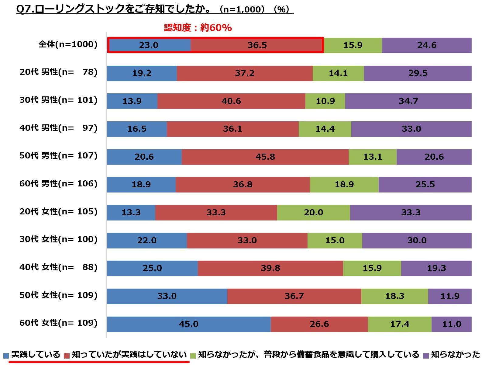・ローリングストック(※)の認知度は6割で、実践者は2割強。実践者は50代女性で33%、60代女性で45%と高い。