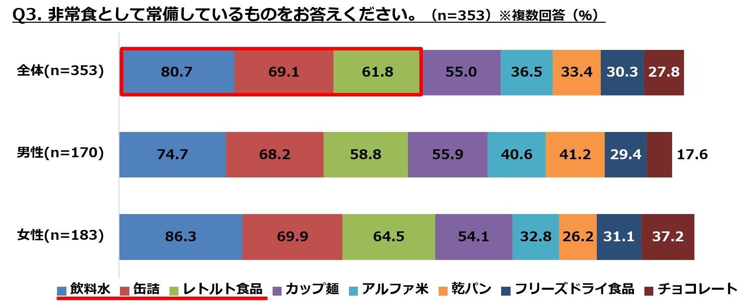 ・常備している非常食は「飲料水」「缶詰」「レトルト食品」がTOP3。「チョコレート」は男女で約20ptの差あり。