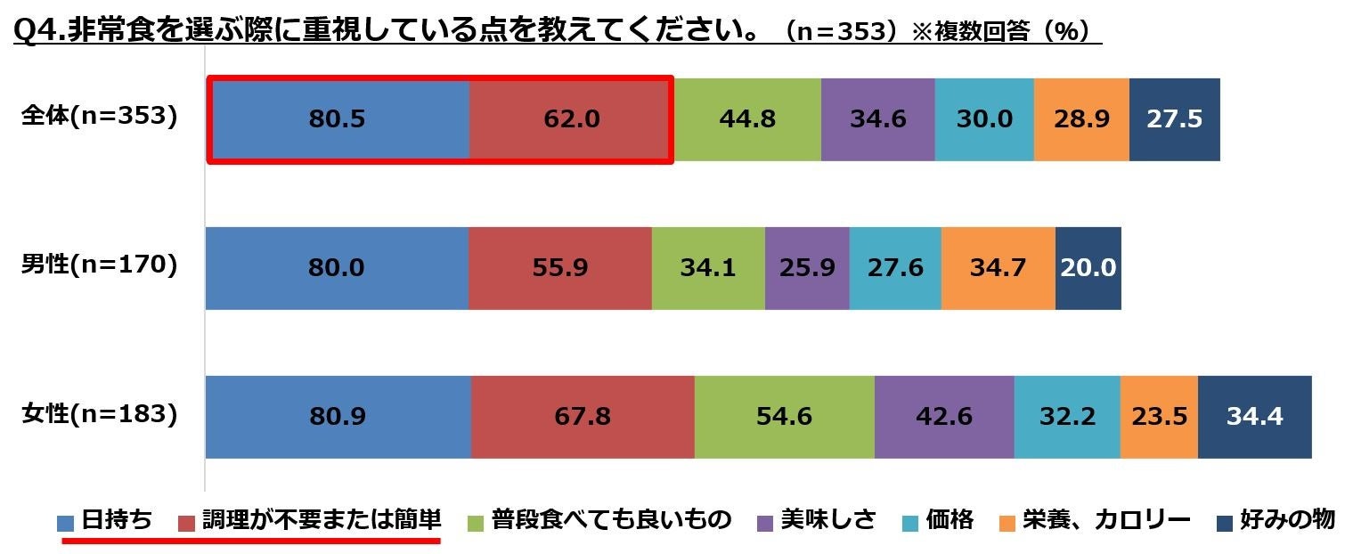 ・非常食の重視点は「日持ち」が最も高く、次いで「調理が不要または簡単」。「栄養、カロリー」は女性では8位だが男性では3位。