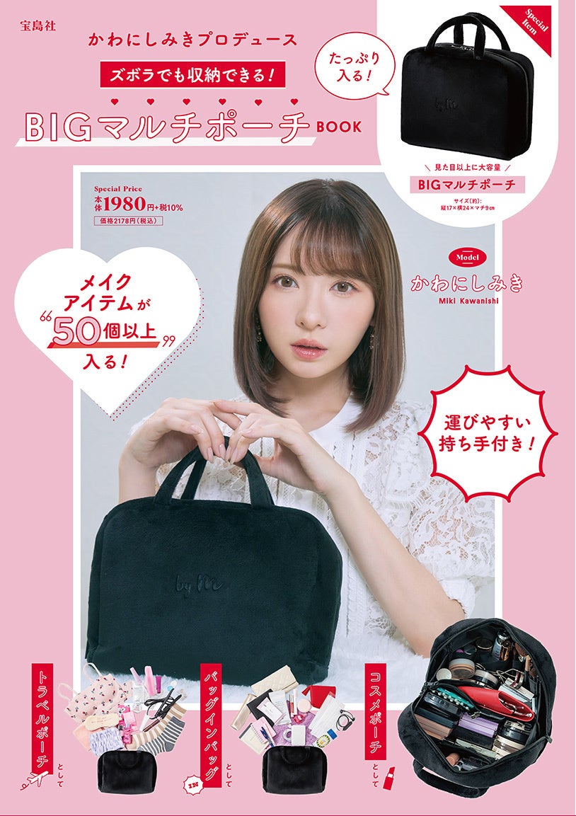 株式会社宝島社(本社:東京都千代田区、代表取締役社長:蓮見清一)が2022年1月20日(木)に発売する、美容系動画クリエイター“かわにしみき”プロデュースのポーチが付録の『かわにしみきプロデュース ズボラでも収納できる! BIGマルチポーチBOOK』の予約受付がスタートしました。特別アイテムは、散らかりがちなコスメなどを、ズボラな人でも簡単に整理収納できる高機能ポーチ。メイク動画で広く知られるかわにしさんが、「必要なものをすべて詰め込めるポーチが欲しい!」という思いでプロデュースしたアイテムです。メッシュポケットやゴム付きポケットなど小物を整理できるポケットを多数備え、ブラシなど長さのあるアイテムが縦に入るサイズにもこだわりました。大容量なので、ベビー用品の収納 や旅行などマルチに活躍する高機能ポーチです。お手に取っていただきやすい価格設定にもこだわっています。 宝島社は、企業理念「人と社会を楽しく元気に」のもと、今後もより多くの方に喜んでいただけるコンテンツを企画開発・提供してまいります。