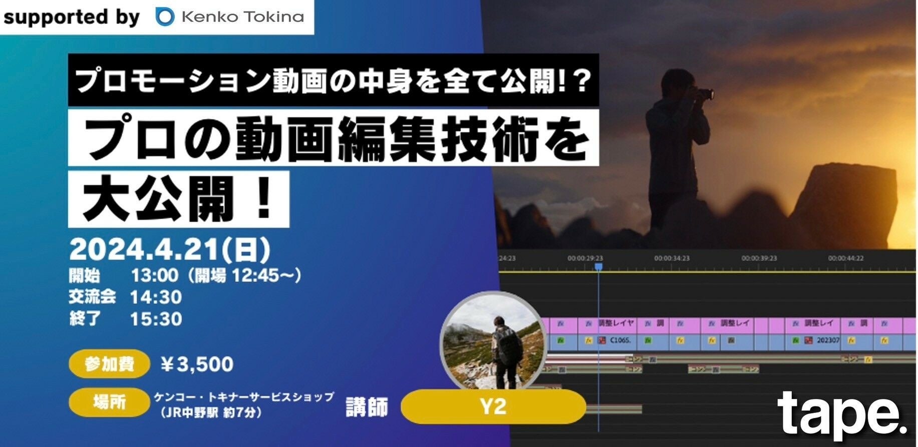 株式会社ケンコー・トキナー(本社:東京都中野区 代表取締役社長:山中 徹)は、動画を学びたい方のために、「動画で人生を豊かに」をコンセプトに国内外で幅広く活動する「tape.」を支援。ケンコー・トキナーセミナールーム(東京都中野区中野5-68-10)にて、4月21日(日)に講座を行います。