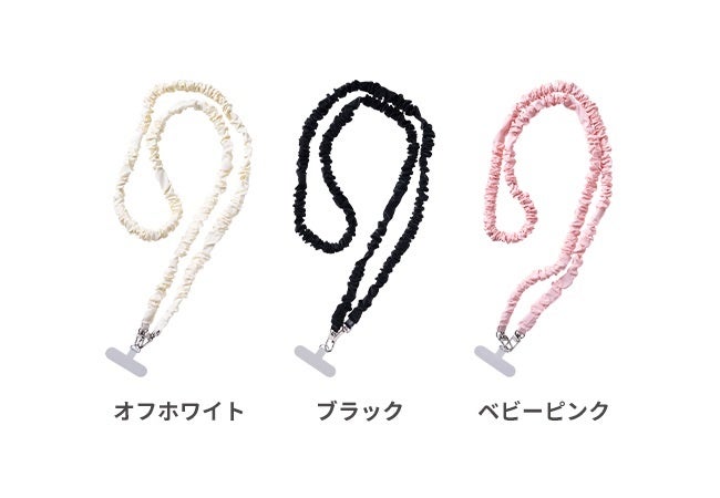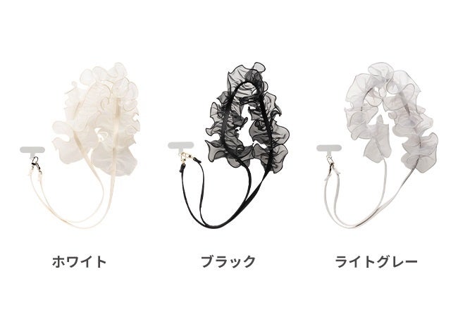 展開する製品は、「くしゅくしゅハンドストラップ」・「くしゅくしゅショルダーストラップ」・「チュールショルダーストラップ」・「リボン付きハートチャームストラップ」です。
