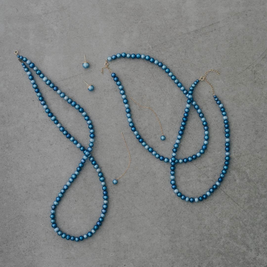 本藍で染め上げる工程で本藍で染め上げる工程で、キズやエクボによって染ムラになってしまったパールを廃棄せず大切に保管し、「ジュエリーとして届けたい」という想いが芽生え、「エシカルインディゴパール」が誕生しました。