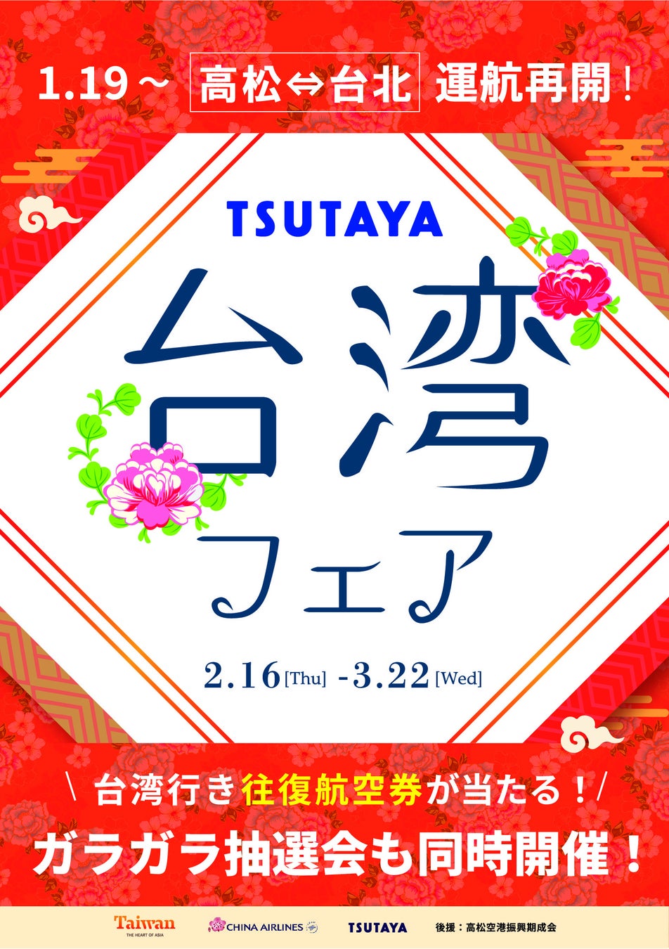 本フェアは、2月16日(木)から3月22日(水)の期間は、香川県の「TSUTAYA高松サンシャイン通り店」にて、3月25日(土)から4月23日(日)の期間は、高知県の「高知 蔦屋書店」にて、「高松-台北線」の運航航空会社であるチャイナ エアライン及び、台湾観光局との共催により、開催いたします。