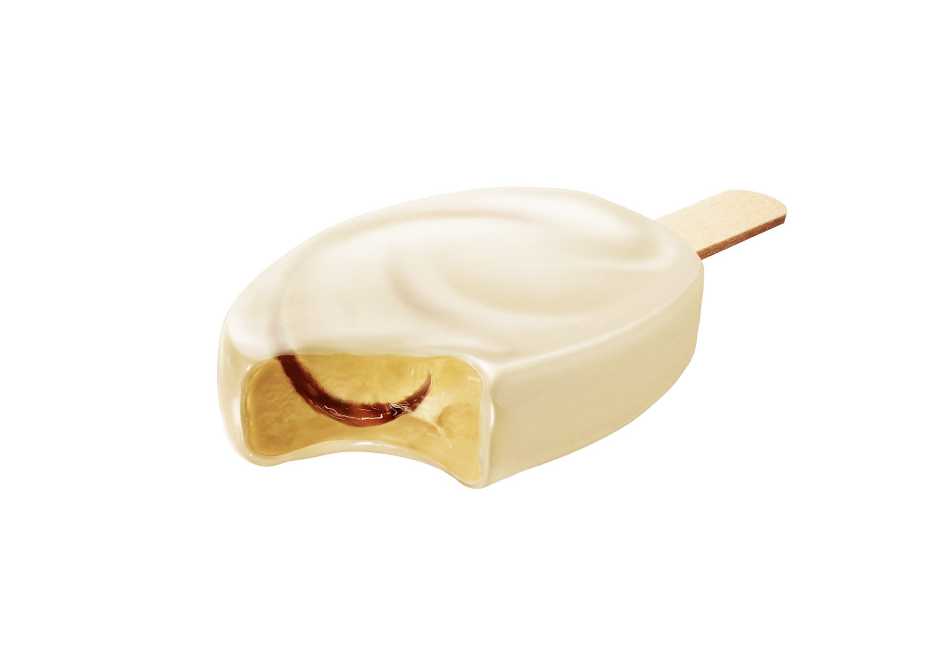 ① コクがありまろやかな甘味のカスタードアイスにほろ苦いカラメルソースをうずまき状に充填し、口どけの良いなめらかなホワイトチョコでコーティングしました。