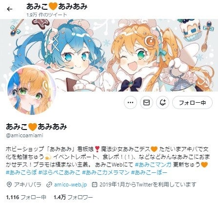 「あみこ」は、2019年1月29日から公式Twitterアカウント(@amicoamiami)をスタート。「あみこ」が、マニアックなホビー情報から、ゆるーい日常の様子までをTwitterで情報発信しています。あみこアカウントが画像&動画で紹介するホビー情報は、ホビーのビギナーからベテランの方まで、幅広くご好評いただいています。