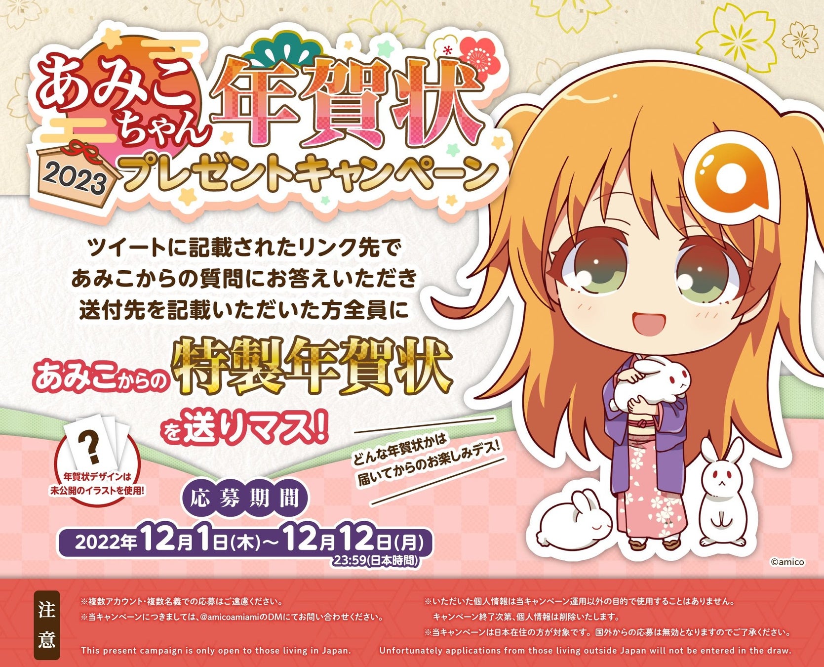 今回は、毎年恒例のあみこから年賀状が届くキャンペーンを、2022年12月1日(木)~12月12日(月)まで、Twitterあみこアカウント(@amicoamiami)で開催いたします。