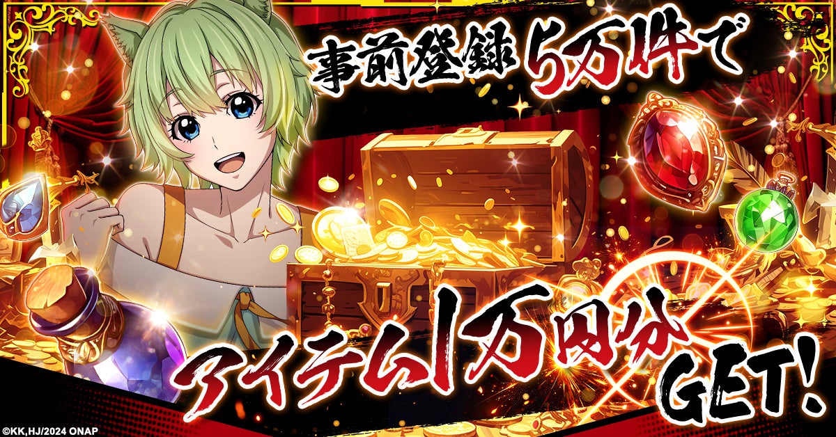 ゲームの事前登録開始を記念して、事前登録キャンペーンを開催いたします。事前登録者数が5万件を達成すると、リリース時に約10,000円分のアイテムを全員にプレゼントします。