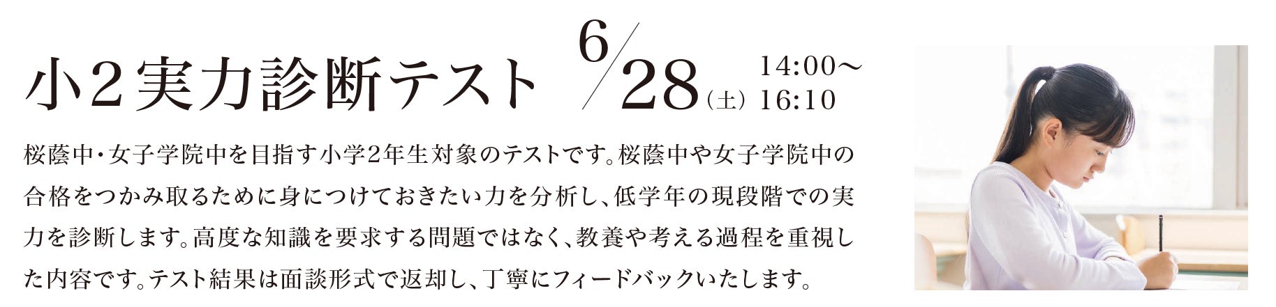 実力診断テストは桜蔭中・女子学院中を目指す小学2年生対象のテストです。桜蔭中や女子学院中の合格をつかみ取るために身につけておきたい力を分析し、低学年の現段階での実力を診断します。高度な知識を要求する問題ではなく、教養や考える過程を重視した内容です。意欲ある小学2年生の皆さんのご参加をお待ちしています。