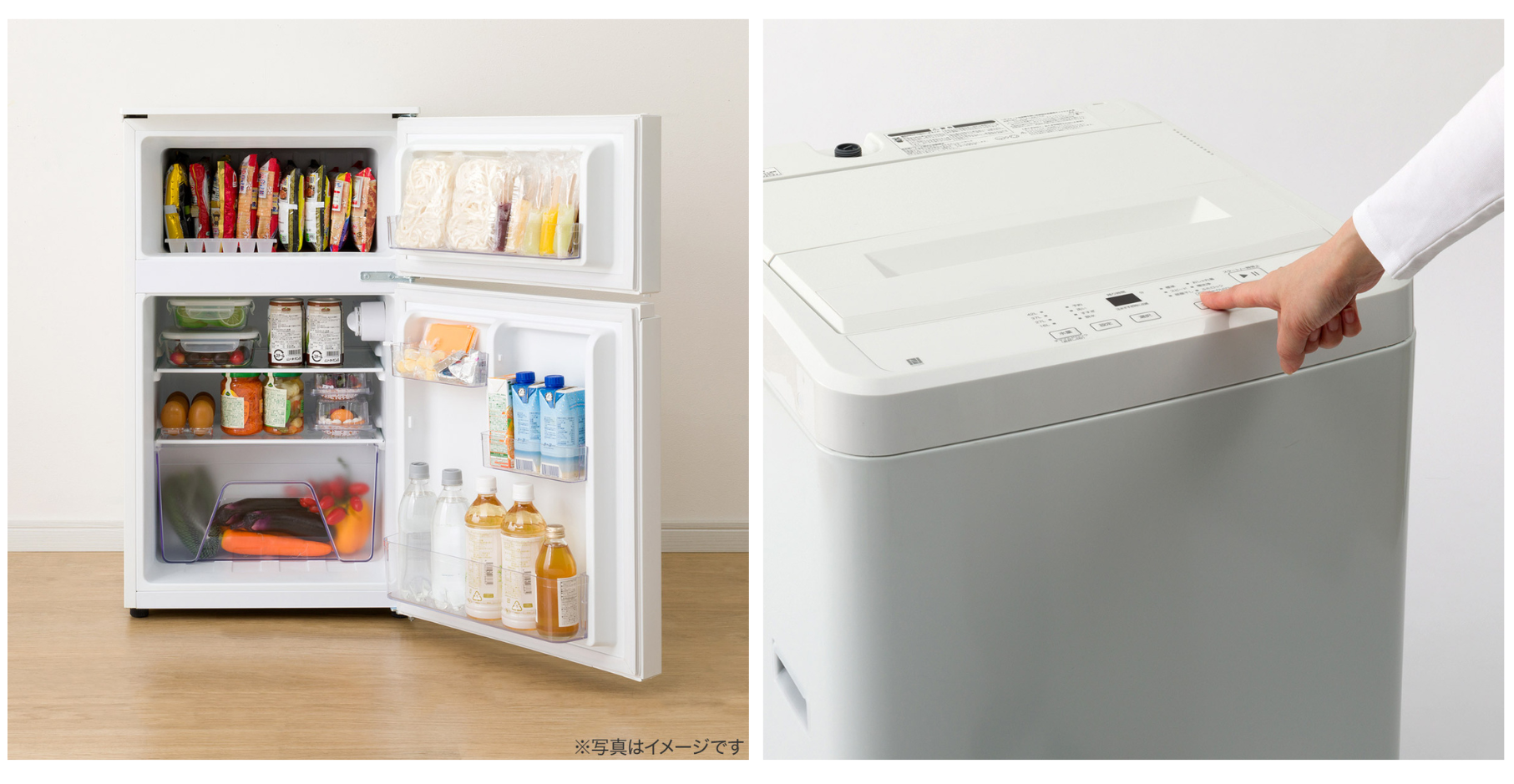 1人暮らしにちょうどいいサイズの冷凍冷蔵庫と、最短10分で洗濯できるスピードコース付きの洗濯機を、毎日の家事の味方に。