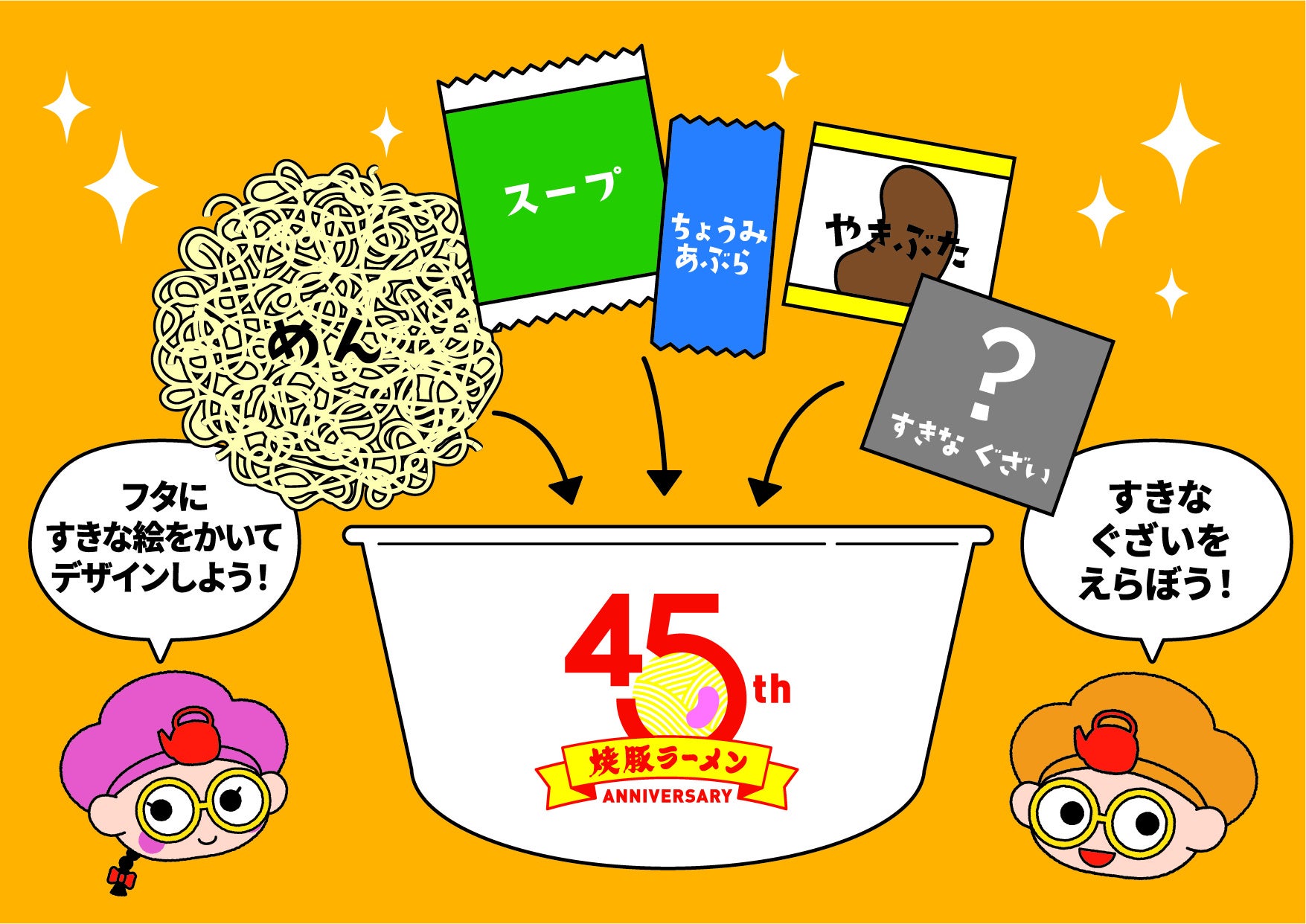 多くのお客様に愛されて、おかげさまで焼豚ラーメンは今年で発売45周年を迎えました!サンポー食品の看板商品である「焼豚ラーメン」を使って、自分だけの「オリジナル焼豚ラーメン」を作ってみませんか?焼豚ラーメンの麺、スープ、調味油、焼豚(やきぶた)をベースに、6種類の具材の中から2つのトッピングを組み合わせ、オリジナル焼豚ラーメンをつくることができます。ふたには自分でデザインしたシールを貼り、世界でひとつだけのパッケージを楽しむことができます。楽しみながら新しいものを作りあげていく、体験型ワークショップです。皆さまのご参加をお待ちしております!