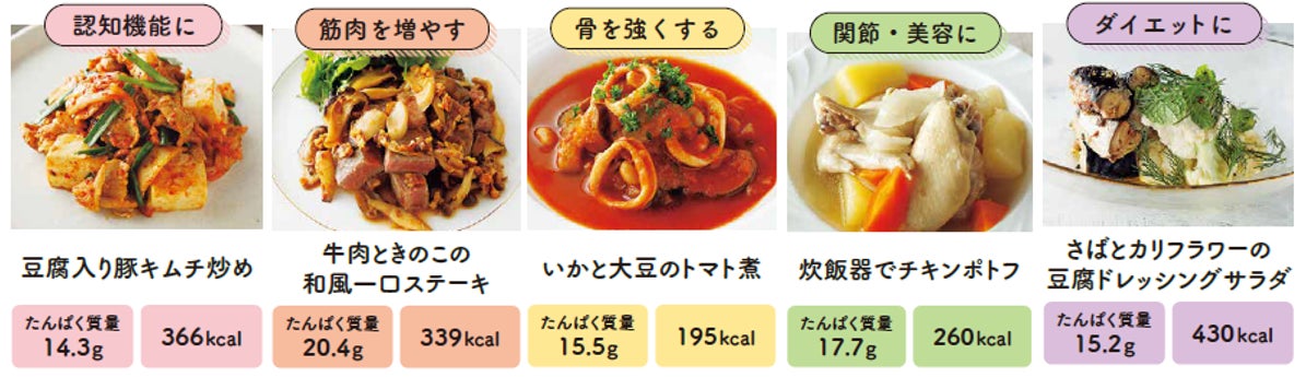 「老けない」と一言でいっても、ケアしたい部分は、筋肉、見た目、骨、脳(認知機能)など人それぞれです。本書では、多角的に「老け」を防止できるよう、「認知機能」「筋肉を増やす」「骨を強くする」「関節・美容」「ダイエット」の5つのカテゴリーに分けて、それぞれに効果的なレシピを紹介します。全レシピにたんぱく質量とカロリーを表示しています。簡単でおいしい、毎日続けられるレシピで、今日からあなたも「老けない」生活をはじめませんか?