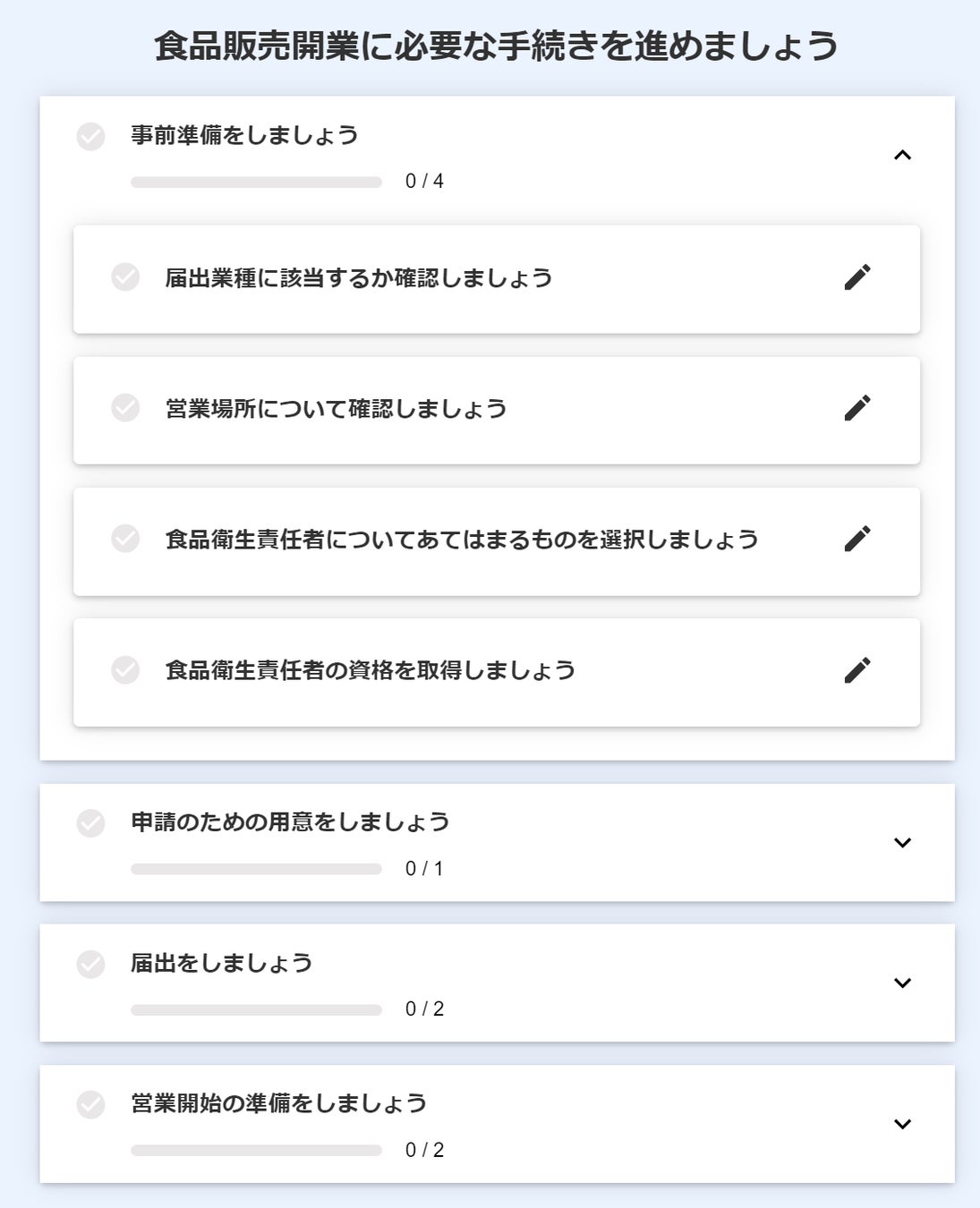 個人事業主または法人として食品販売業・建築士事務所・指定給水工事業を開業するには、届出要件を満たすために数多くのステップがあり、それぞれ間違いのないよう準備していく必要があります。「freee許認可」では、どのような要件を満たせばよいのかを入力フォームの質問に答えていくだけでわかりやすく表示します。