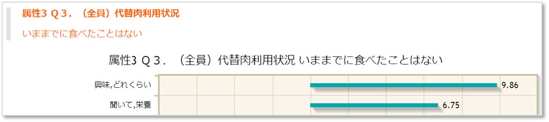 喫食未経験者は、代替肉に対して関心の低さやマイナスイメージをもっておりトライアルにつながっていないようです。未経験は6割以上のため、イメージ改善によりトライアル機会を増やす施策が必要そうです。