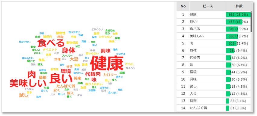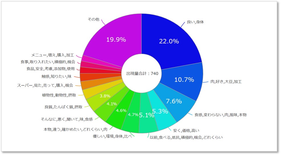 近年、スーパーなどでも代替肉製品を手軽に購入できるようになりました。健康意識の高まりや環境問題を背景に利用する人が増えているようです。そのため当社では「代替肉に関するアンケート調査(第2回)」を実施し、代替肉の喫食意向の理由4,781件の自由回答データを元に、弊社テキストマイニングツール「TextVoice」で分析したので、その結果をご紹介します。