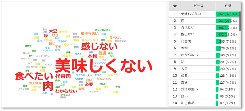 美味しくない、(肉を)食べたい、(肉を)感じないといったワードが上位にきています。