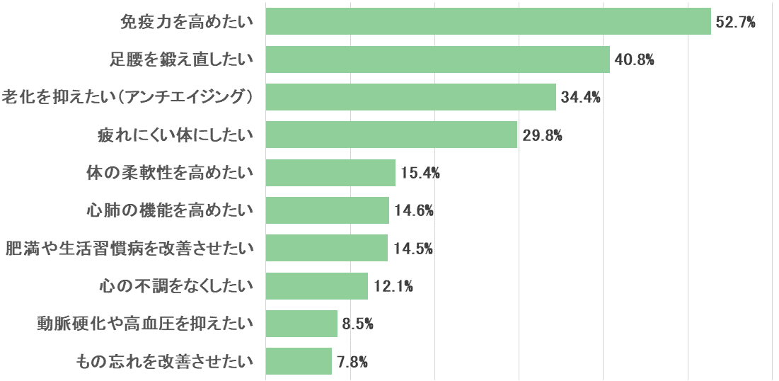 こうした体調の変化をうけて、コロナに負けない体づくりや「ポストコロナ(コロナ後)」の生活を健康的にするために、意識して取り組みたいことを選択肢から選んでもらったところ(複数回答)、半数を超す人が選んだのが「免疫力を高めたい」でした。「足腰を鍛え直したい」が4割で続いています。