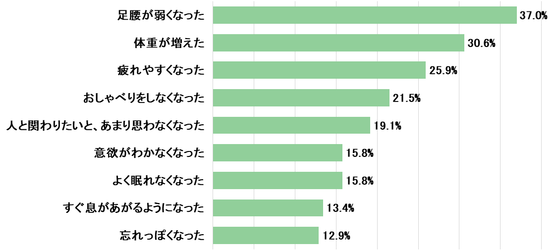 ■コロナ禍の体調変化で、「足腰弱く」「体重が増え」「疲れやすく」