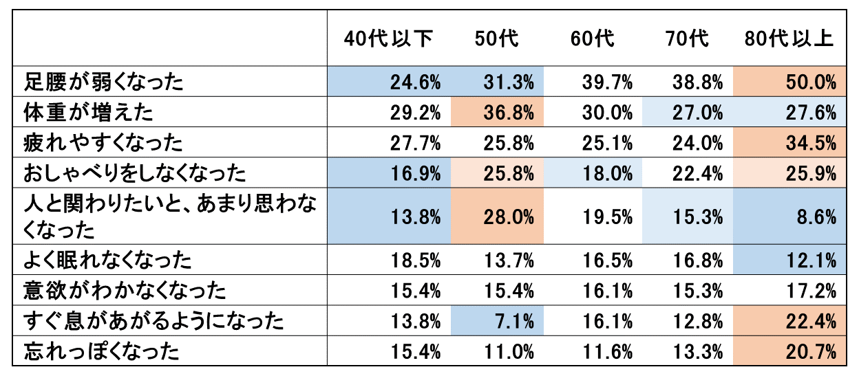 2年余りに及ぶコロナ禍で、体調の変化を感じている人はざっと6割。具体的な変化としてあがった(複数回答)のは、筋力低下による足腰の衰えや、運動不足などからの体重増、そして、疲れやすくなったという感覚です。