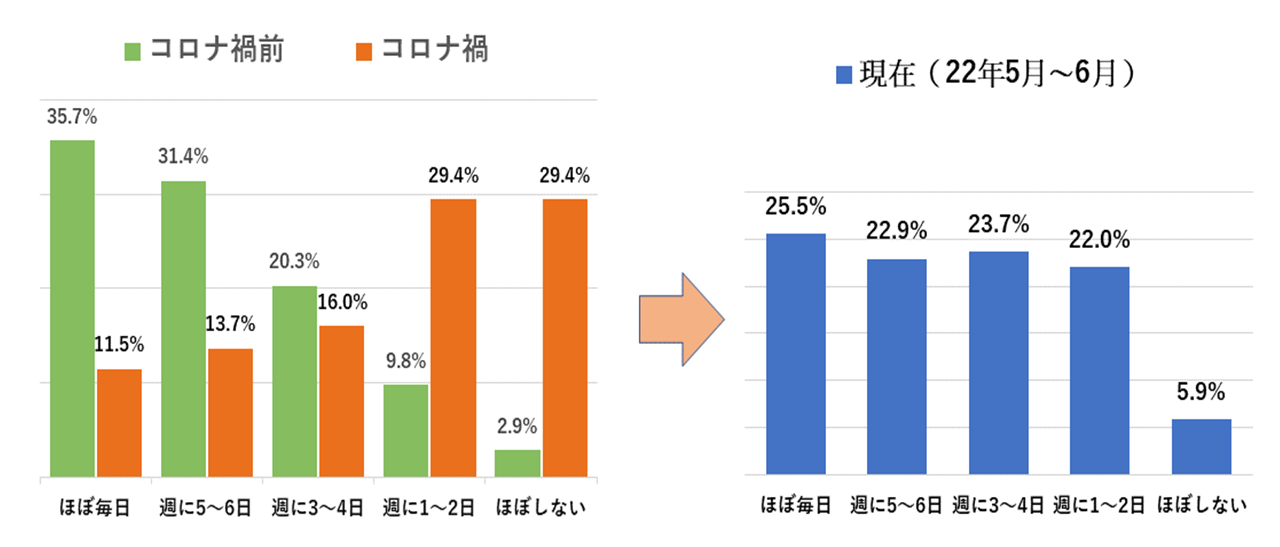 新型コロナへの最警戒時、全体の6割近くを占めていた「ほぼ外出しない」「週に1~2日」が、合わせて3割足らずに半減する一方、それぞれ1割ちょっとに落ち込んでいた「ほぼ毎日」「週に5~6日」は2割台へ倍増しました。ただ、「ほぼ毎日」「週に5~6日」という人の割合は、コロナ禍以前と比べると、まだ10ポイントほど低く、依然、外出を控えめにしたり、テレワークで在宅勤務を選択したりする人が少なくないことがうかがえます。