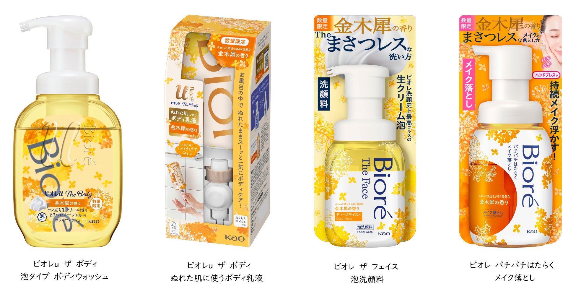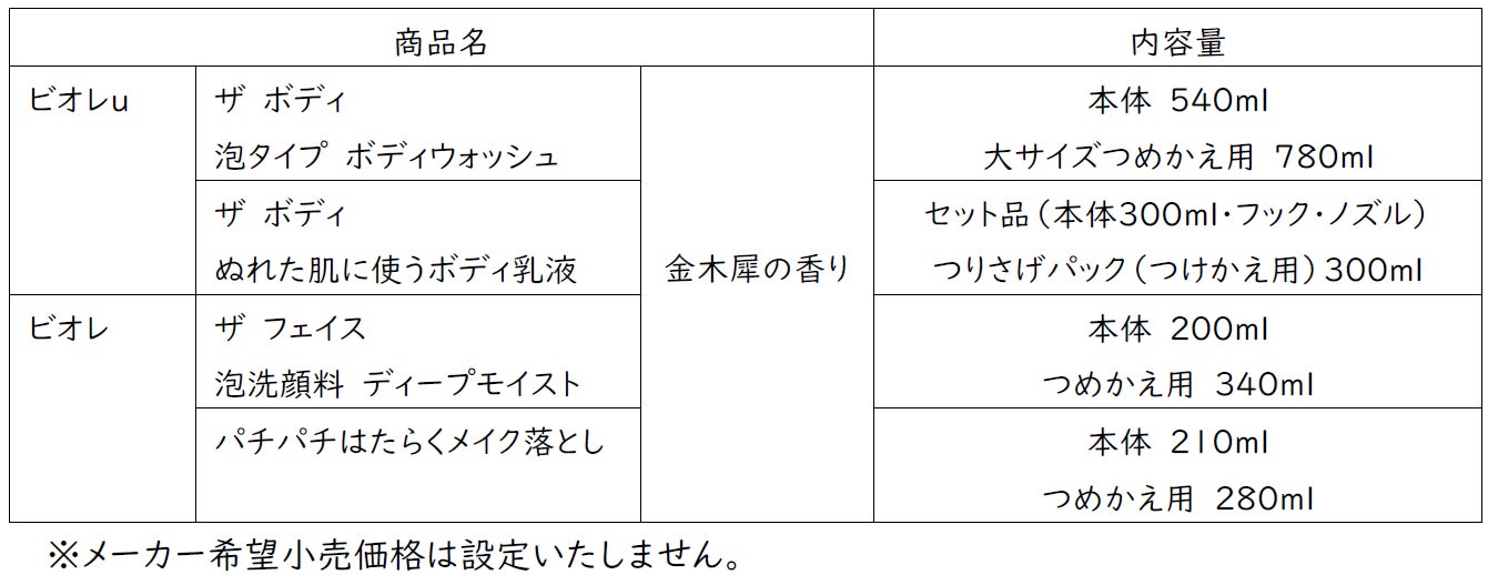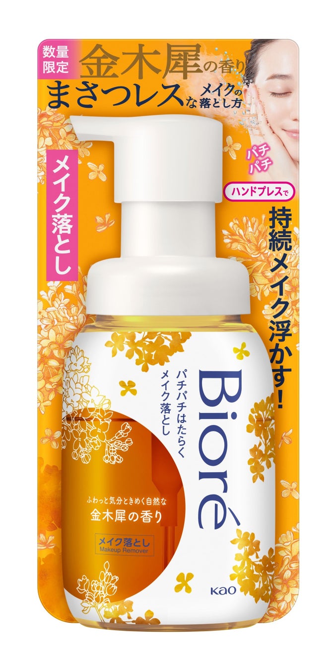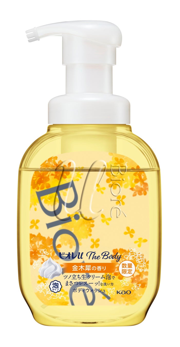 今年8月にリニューアルし、進化したツノ立ち生クリーム泡での手のひら洗いを提案する「ビオレu ザ ボディ 泡タイプ ボディウォッシュ」をはじめ、「ビオレ ザ フェイス 泡洗顔料」など、「ビオレ」は“まさつレス”な素肌の洗い方の提案を続けてまいりました。身体で、お顔で、“まさつレス”な洗い方で、今だけの“ふわっと気分ときめく自然な金木犀の香り”を、こだわりのパッケージデザインでお楽しみください。