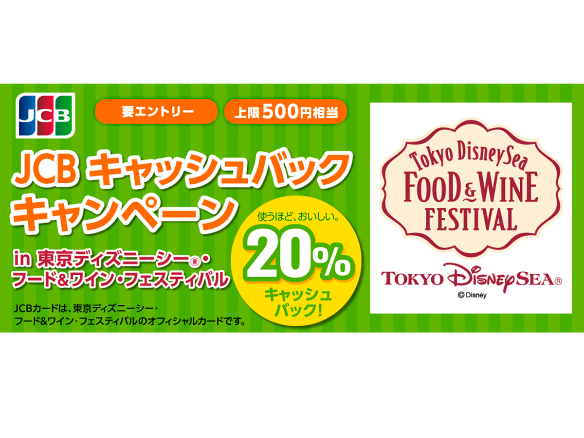 東京ディズニーシー・フード&ワイン・フェスティバル期間中の東京ディズニーシーのレストランやフードワゴン(ポップコーンワゴンなど)で、参加登録したJCBカード(タッチ決済も対象)を利用すると、ご利用金額より20%をキャッシュバックします。(上限:500円相当) ※一部のカード発行会社は、ポイントプレゼントになるなど、還元方法が異なります。 ※参加登録が必要です。 |