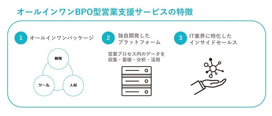 リード獲得から受注までの営業プロセスに潜むデータを詳細に定義づけし、蓄積、可視化、分析、活用することで中長期的な営業活動に進化させるアウトソーシングサービスです。独自開発したインサイドセールスの活動を効率的、効果的に行えるプラットフォームを利用することにより、自社でのツールの用意やツール利用の教育が不要となります。