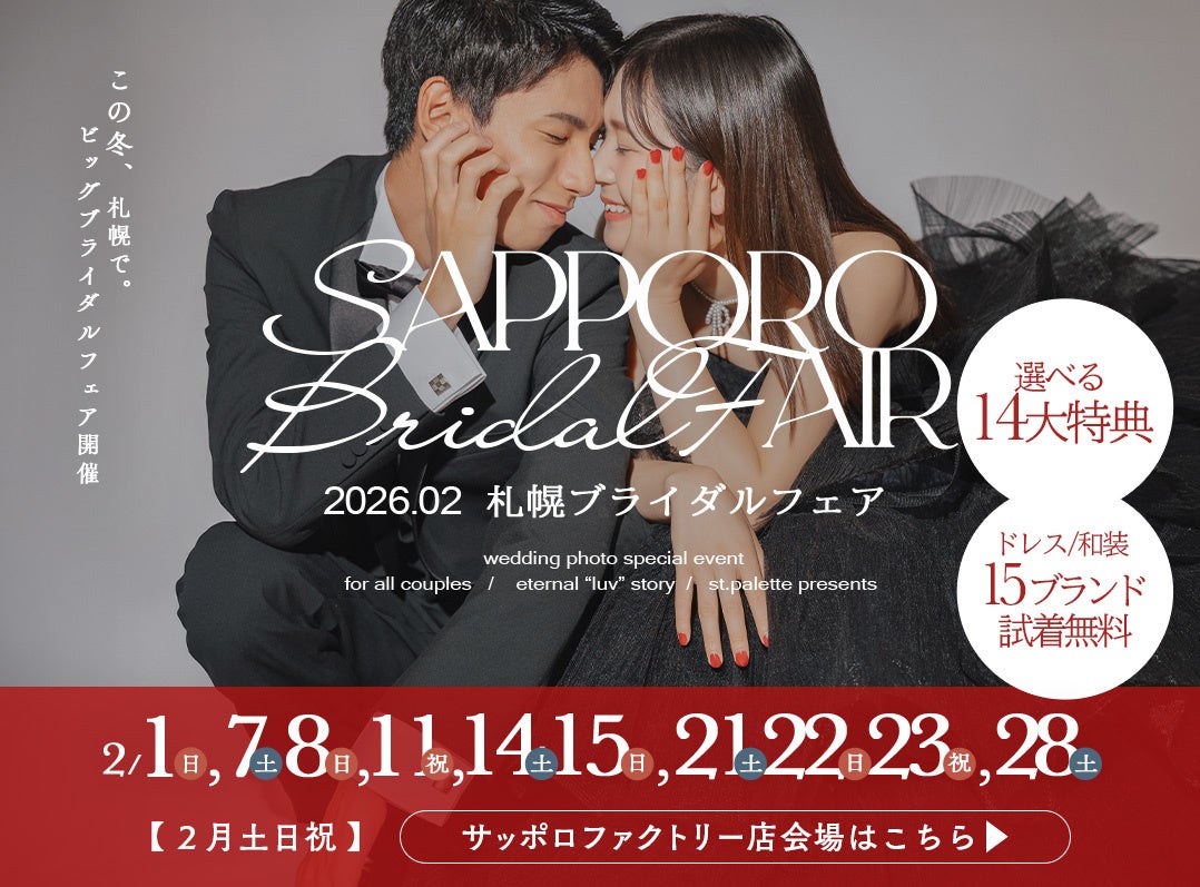有限会社三景スタジオ(本社:北海道旭川市、代表取締役:大西康弘)が運営する「写真工房ぱれっと」は、2026年2月の週末限定で、これから結婚写真を検討する20代の花嫁様に向けた「札幌ブライダルフェア」を開催いたします。 「JILL STUART」や「ISAMU MORITA」 といった憧れのブランドドレスの試着会に加え、ロケーション撮影プランが最大20%OFFになるフェア限定特典をご用意。「写真」という枠を超え、撮影そのものを「一生の思い出」にする新しいウェディングの形をお届けします。