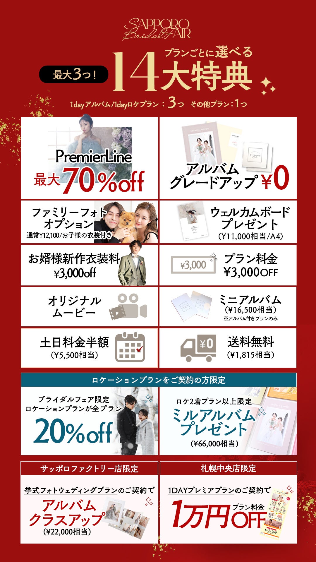 今回のフェアでは、お客様の声から生まれた「14大特典」をご用意しました。 1dayプランやロケーションプランをご成約の方には、以下の人気オプションから最大3つをプレゼントいたします。