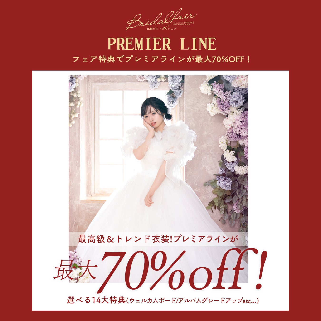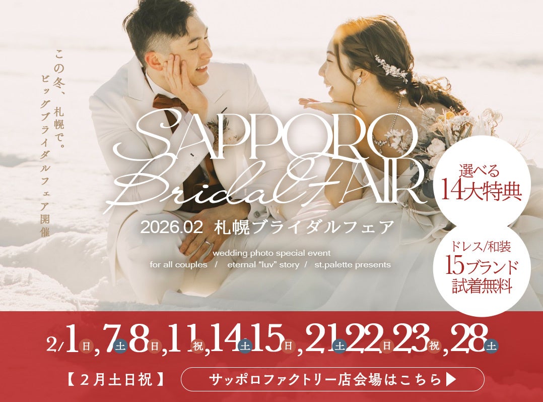 2026年2月の週末、写真工房ぱれっと札幌2店舗で「札幌ブライダルフェア」開催!最高級ドレス最大70%OFFやロケ20%OFFなど、過去最大級の14大特典をご用意。お得に理想の結婚写真を叶えるチャンス