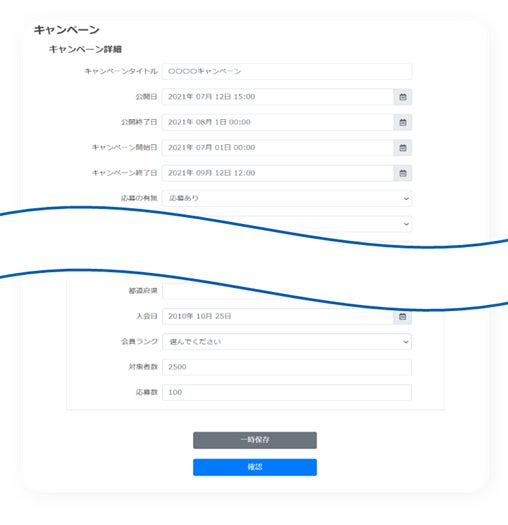 既定の入力フォームにタイトル、公開日、内容、画像等の情報を入力するだけで、簡単にキャンペーンやクーポ