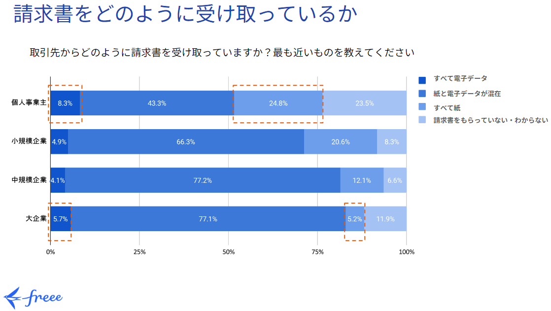 請求書をどのように受け取っているかという質問には、「すべて紙」という回答は大企業だと約5%、個人事業主は約25%と5倍の差がありました。一方で「すべて電子データ」という回答は個人事業主・法人いずれも10%満たないという結果が出ました。
