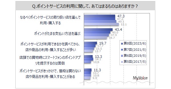 ポイントサービスの利用に関する行動であてはまるものを選んでもらったところ(複数回答)、「なるべくポイントサービスの取り扱い店を選んで利用・購入する」が47.3%となっています。続く「ポイントがたまる支払い方法を選ぶ」は43.4%、過去調査と比べて増加傾向です。