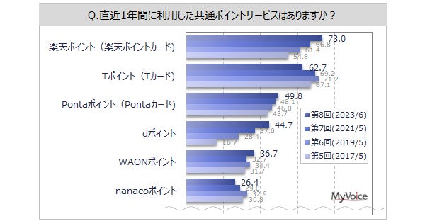 【ポイントサービスに関する調査】直近1年間に利用した共通ポイントサービスは、「楽天ポイント」が7割強、「Tポイント」が6割強、「Pontaポイント」「dポイント」が各40%台