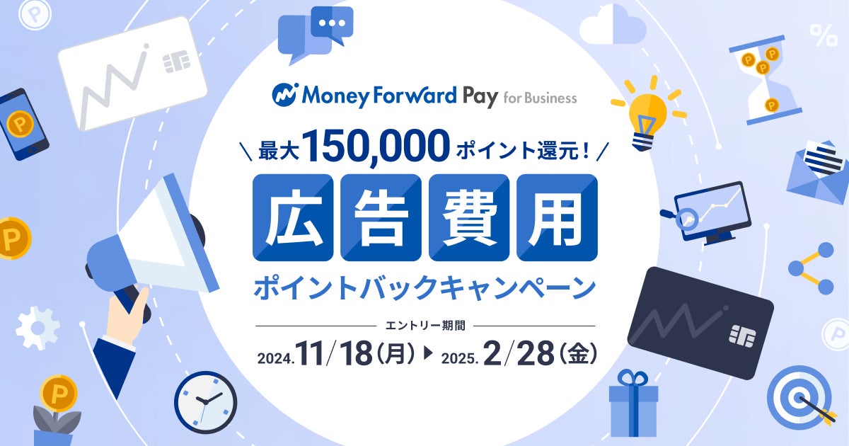 株式会社マネーフォワードは、『マネーフォワード ビジネスカード』において、「『マネーフォワード ビジネスカード』冬の広告費用ポイントバックキャンペーン」を実施します。本キャンペーンは、2024年12月1日(日)から2025年2月28日(金)の期間中に、対象の広告費用を『マネーフォワード ビジネスカード』で決済することで、通常のポイント還元に加えて最大150,000ポイントが還元されます。