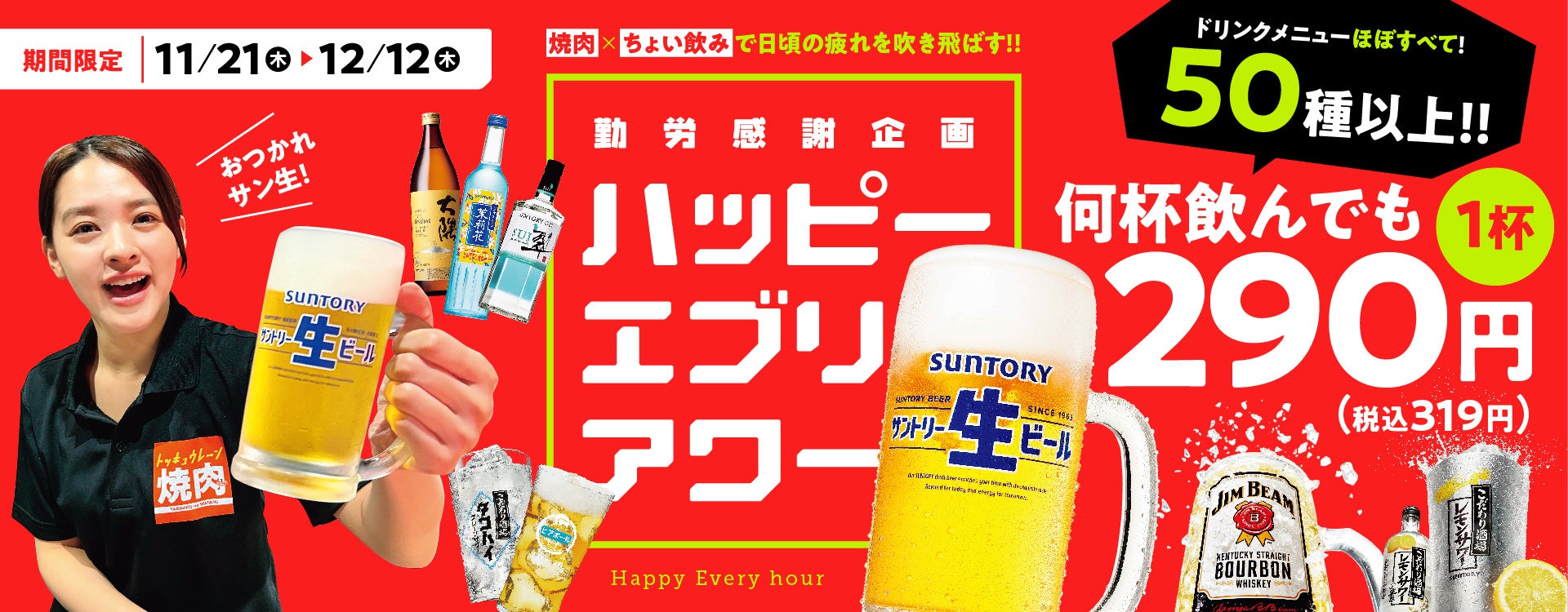 ワタミ株式会社(本社:東京都大田区、以下ワタミ)が全国で展開する、高品質な焼肉をリーズナブルな価格で提供する「焼肉の和民」は、勤労感謝の日をきっかけに2024年11月21日(木)から12月12日(木)までの期間、「サントリー生ビール」をはじめ、「ジムハイ」や「こだわり酒場のレモンサワー」「ビアボール」「タコハイ」まで50種類以上のほぼすべてのドリンクを何杯飲んでも1杯290円(税込319円)で提供する「ハッピーエブリアワー」を開催いたします。勤労感謝の日を間近に一年の労をねぎらう「焼肉×ちょい飲み」の機会として、仲間や同僚と仕事帰りはもちろん、ひとり焼肉で焼肉定食にビールを追加するなど、気軽に焼肉時間を楽しむきっかけにしていただければと思います。是非この機会にお立ち寄りください。