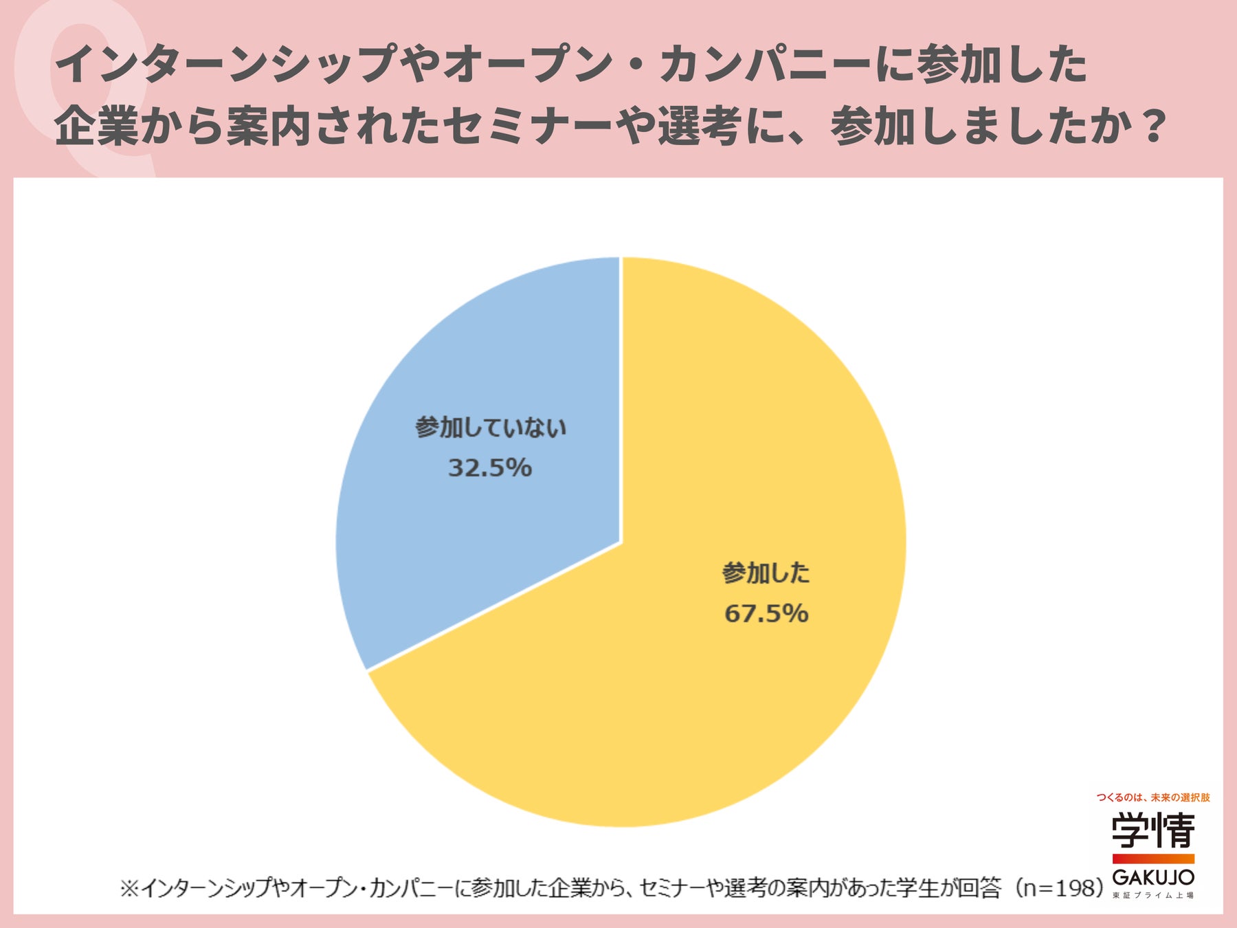 インターンシップやオープン・カンパニーに参加した企業から案内されたセミナーや選考に「参加した」と回答した学生が67.5%に上りました。「参加した」と回答した学生からは、「インターンシップに参加して基本的な情報を得られたので、セミナーや選考に参加し、より企業理解を深めたいと思った」「インターンシップで社員の方から直接話を聞くことができ、志望度が高まった」といった声の他、「この時期に面接を経験しておきたいと思った」「選考参加を通して、自分の就活の軸が定まるのではないかと思った」「できるだけ早く内定を獲得しておきたい」などの声も上がりました。「参加していない」と回答した学生からは、「インターンシップには参加したものの、あまり志望度が上がらなかった」「現段階では、選考よりも他の企業のインターンシップに参加することを優先しようと思った」などの声が寄せられました。